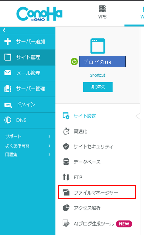 ② ConoHaサーバ管理画面のファイルマネージャに移動