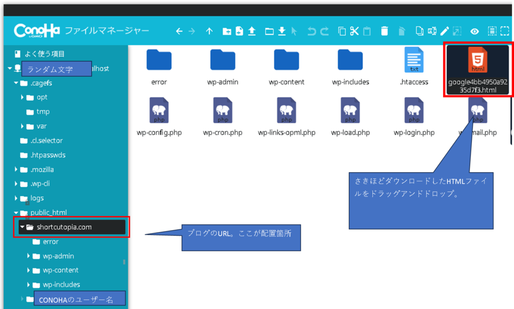 移動後、先ほどダウンロードしたHTMLファイルをドラッグアンドドロップしてアップロードします。