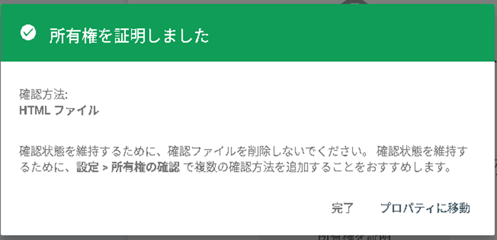 HTMLを配置したら、元の画面に戻ってGoogleSerchConsoleの確認ボタンを押すと、以下の画面が表示されます。この画面が出れば成功です。
