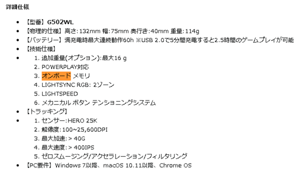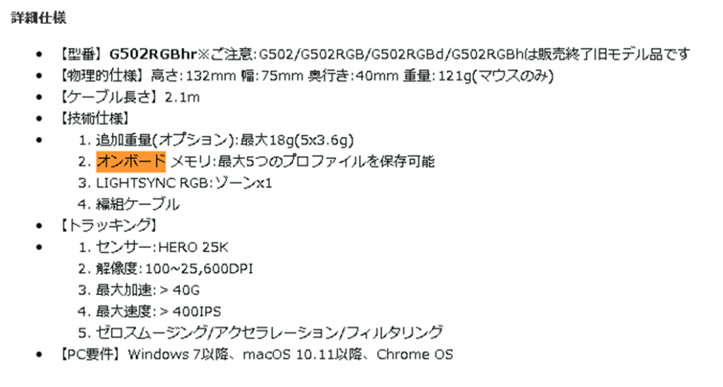 有線G502の詳細仕様です。オンボードメモリがちゃんと掲載されています。