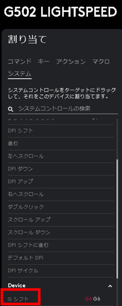 なお、Gシフトモードですが、Logitech G HUBアプリにて割り当て欄のシステムタブ⇒Deviceのところにあります。