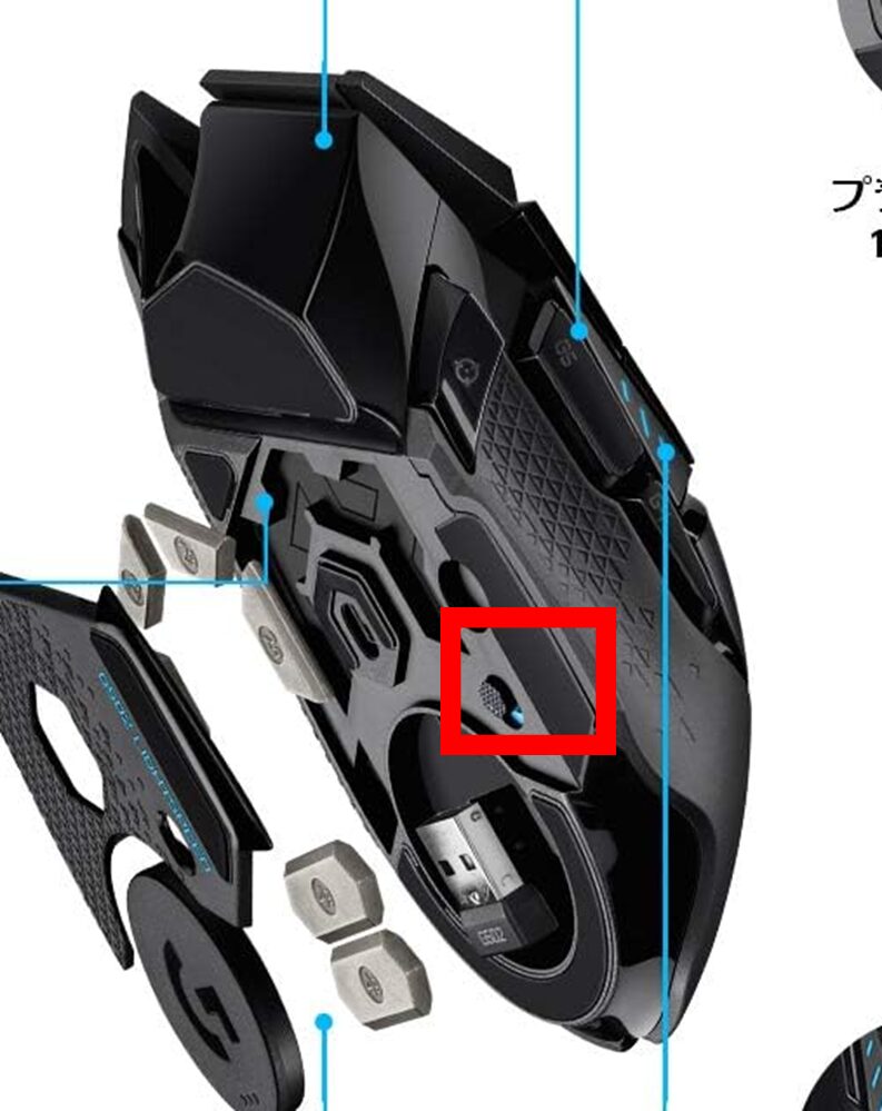 G502のUSB受信機を自宅のPCに接続して、G502の裏面にあるGHUBを起動します。マウスの背面にあるボタンもONにして起動しておきましょう。
