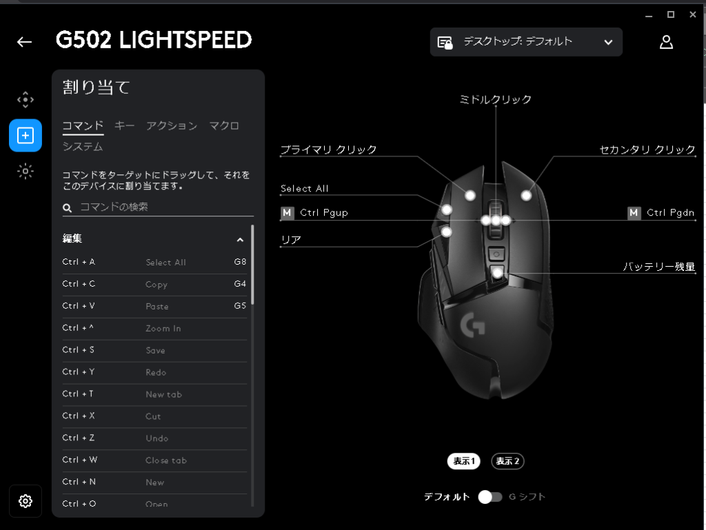 G502の部分をダブルクリックするとこのような画面になります。ここで割り当て設定が可能です。上に「デスクトップ:デフォルト」とありますがこれはプロファイル名です。プロファイルごとに設定を保存できるということですね。