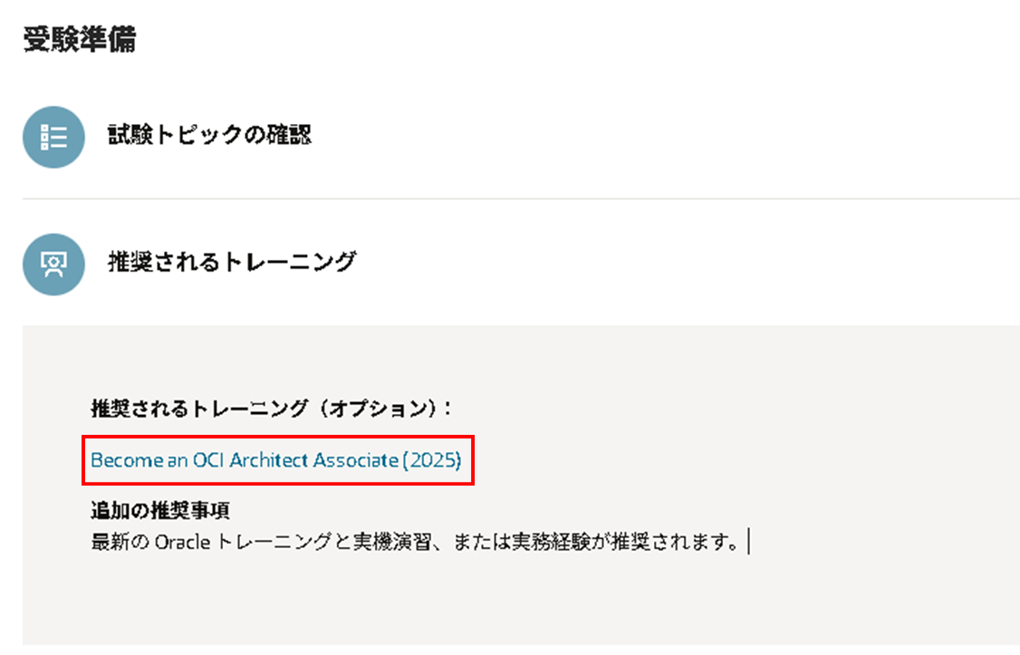 ※以下URLに 推奨されるトレーニングとしてBecome an OCI Architect Associate (2025) が記載されています。