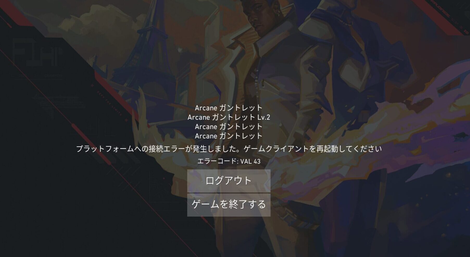 【エラーコード:VAL43】プラットフォームへの接続エラーが発生しました。ゲームクライアントを再起動してください:Valorant